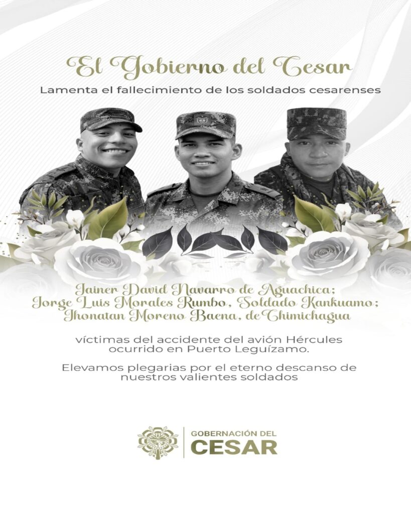 A medida que van pasando las horas y se consolida la información, se conocen los nombres de militares oriundos del Cesar que perdieron la vida en el acidente aéreo de Putumayo, ellos son: Jainer David Navarrao, oriundo del municipio de Aguachica; Jorge Luis Morales Rumbo, soldado kankuamo; y Jhonatan Moreno Baena, natural del municipio de Chimichagua.